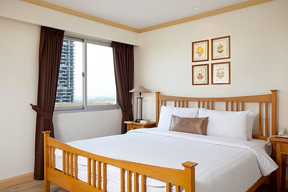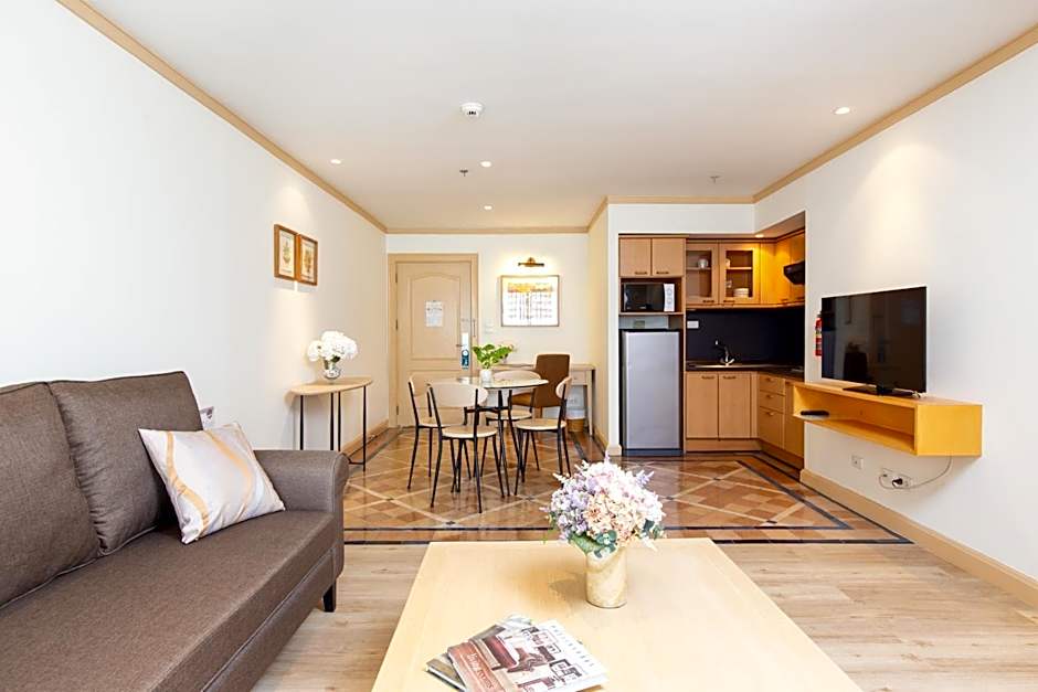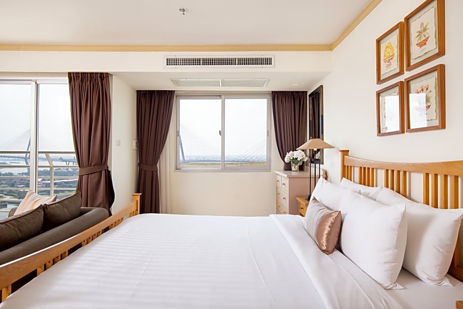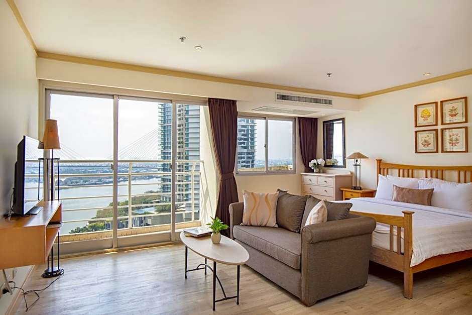 Spacious apartment offers partial views of the Chao Phraya River, full kitchen facilities and a separate living area.